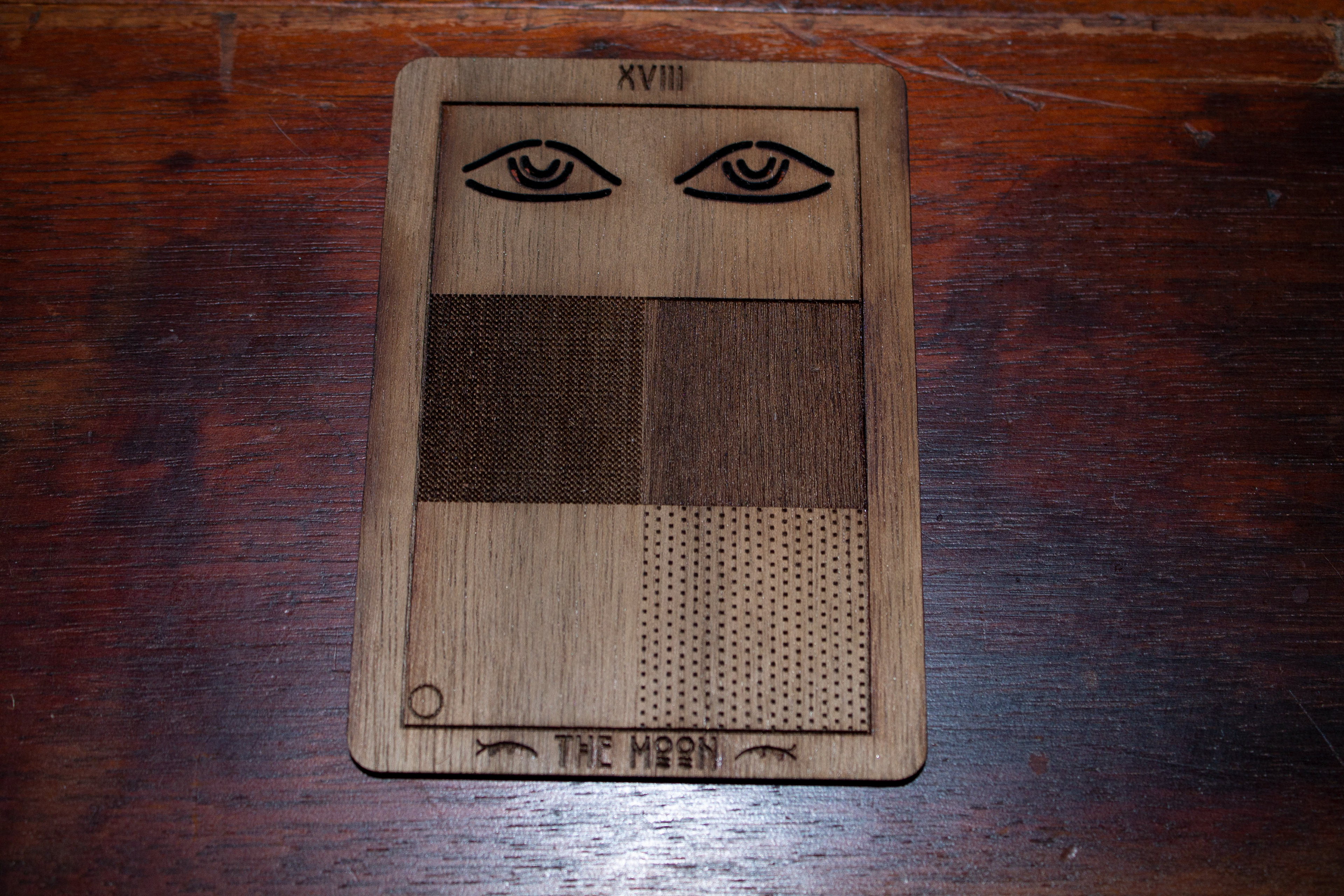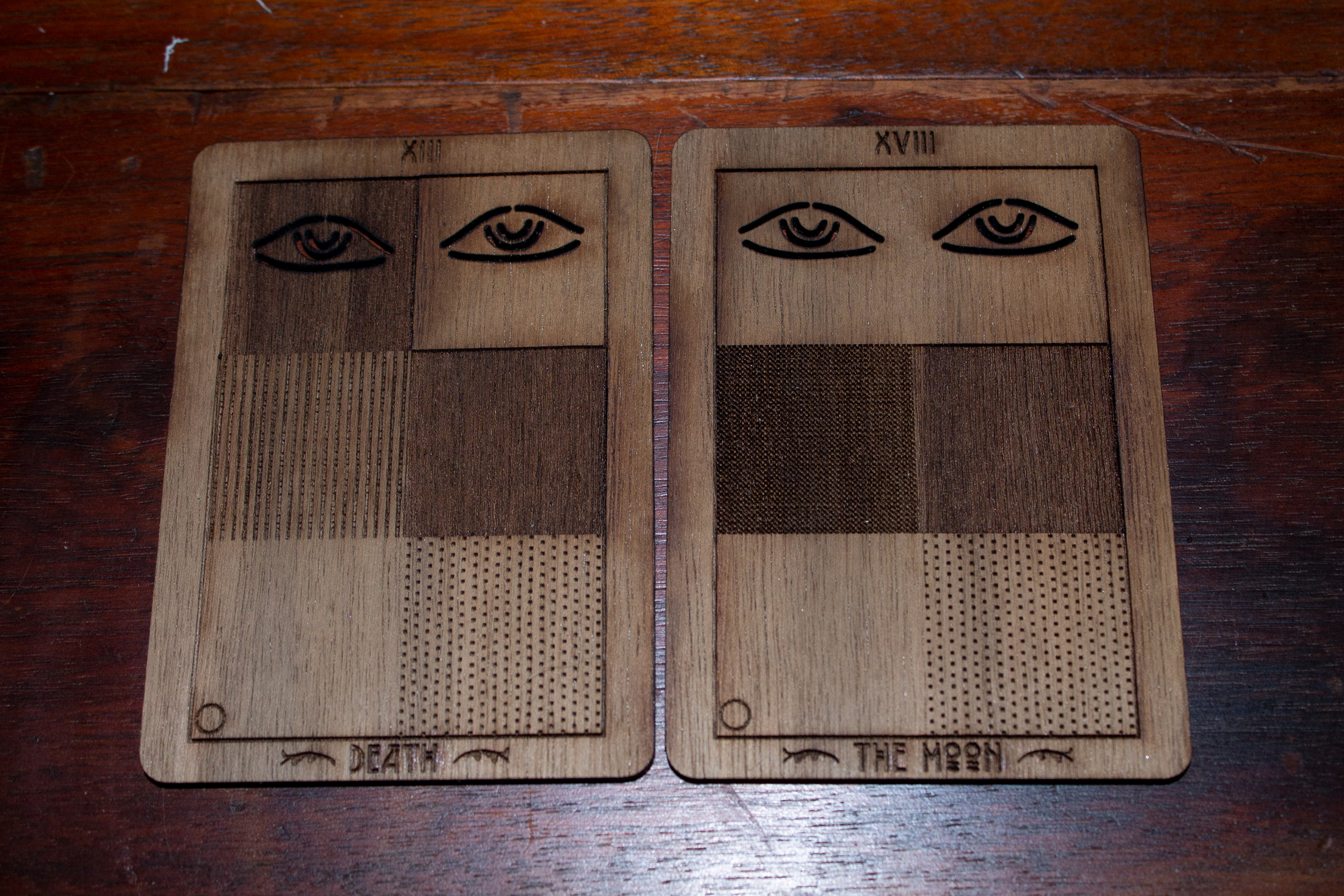 Laser etched onto water-colored paper and wood blocks.
